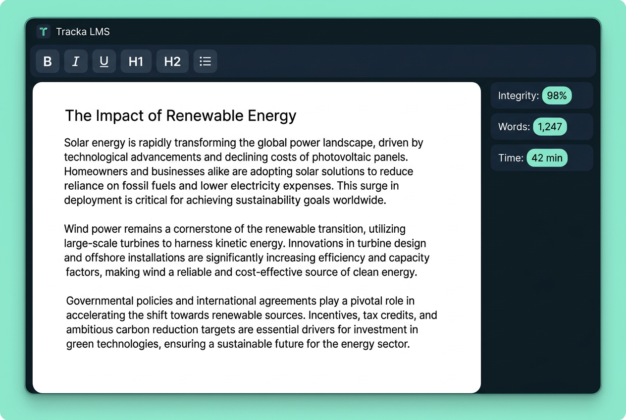 Tracka LMS is the platform for the AI era. Students write in a modern editor, self-proctor locally, and submit work backed by cryptographically signed activity reports — verifiable by anyone, in seconds.